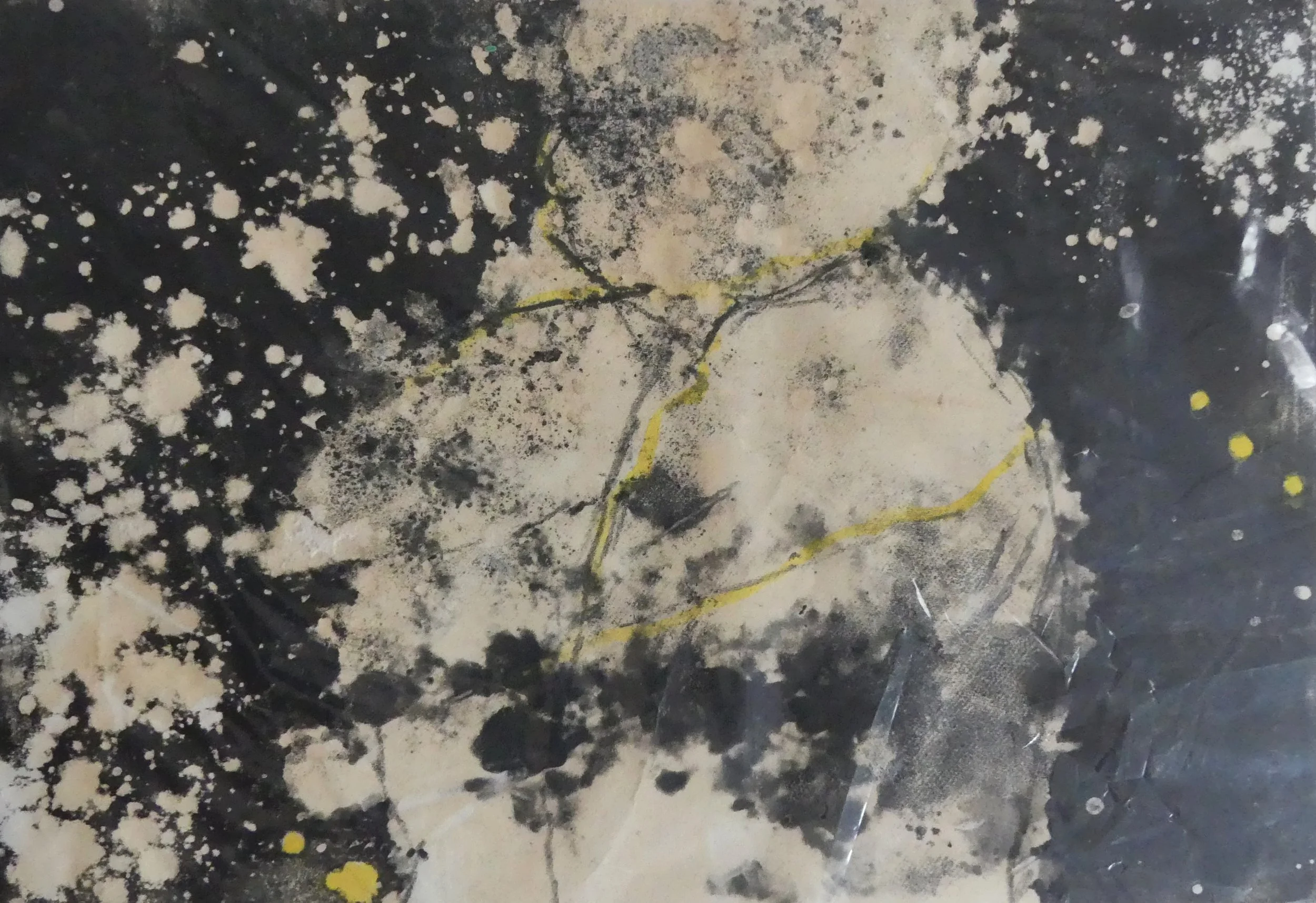 Abstract black, white, and yellow graffiti or paint splatter on a surface with cracks and textures.