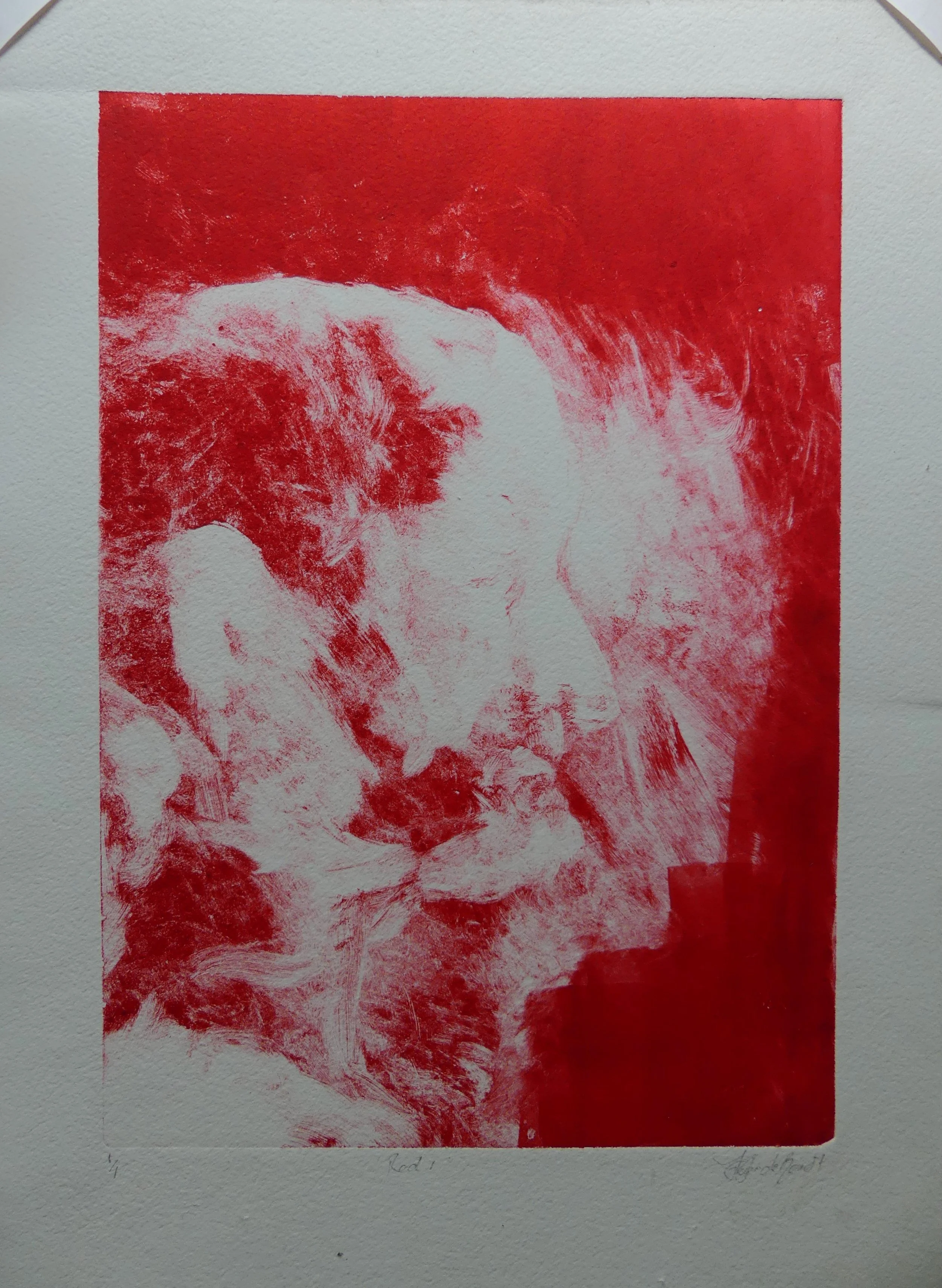 An abstract mixed media monotype embossing featuring splashes of red, black, white, some green, and yellow colors with brush strokes and drips.
