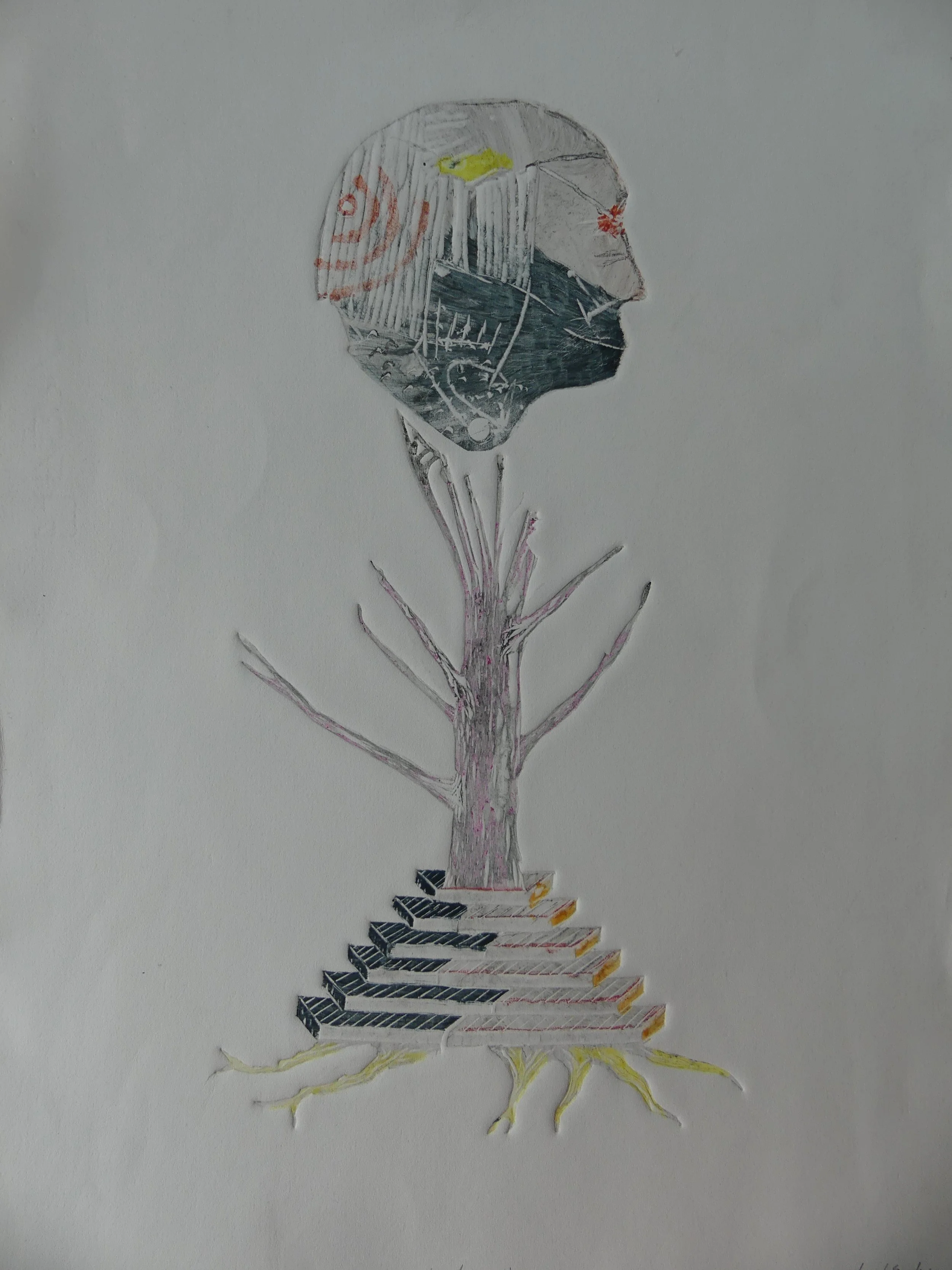 A mixed media monotype linocut embossing artwork featuring a human profile with a detailed wing inside the head, and elements resembling a gear, a ladder, and a rock at the bottom.